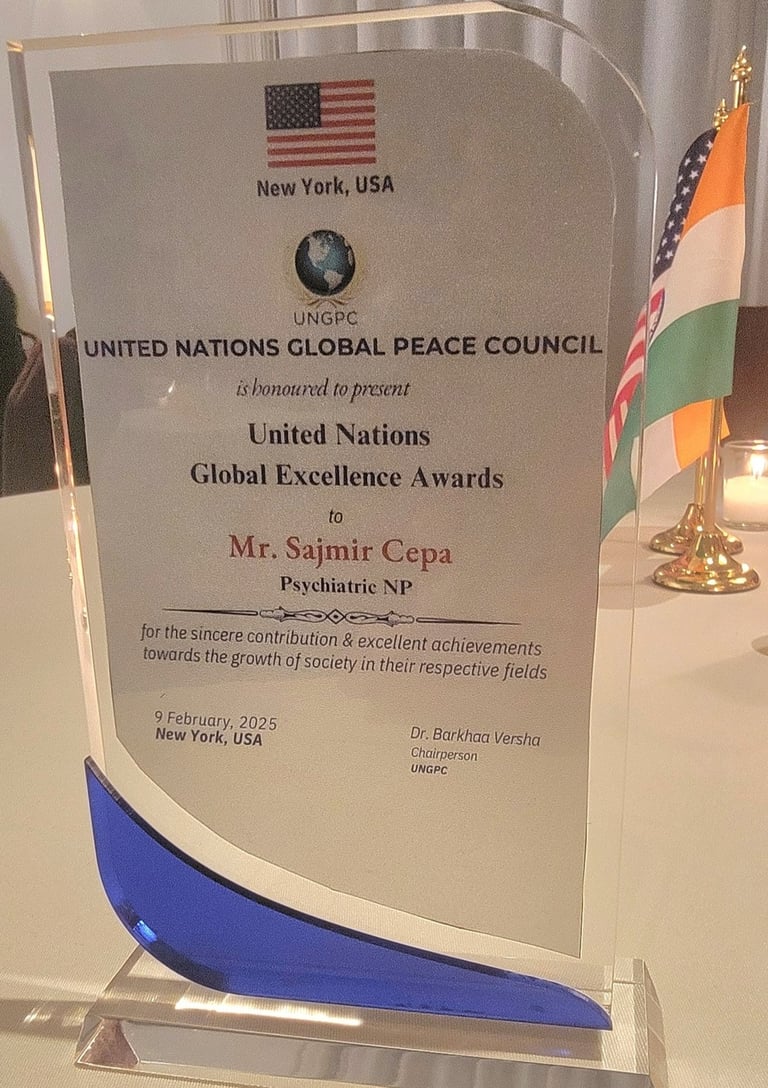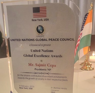 Recently, I was honored with the Global Excellence Award at the United Nations Global Peace Council for my contributions to the field of psychiatry and mental health advocacy.