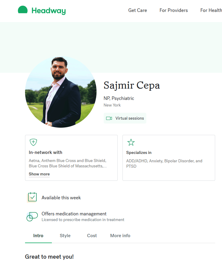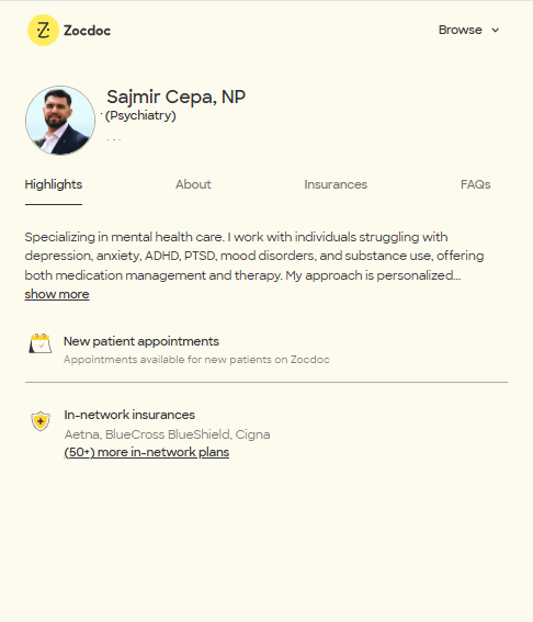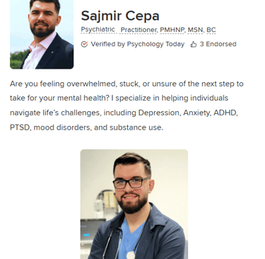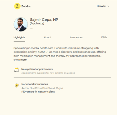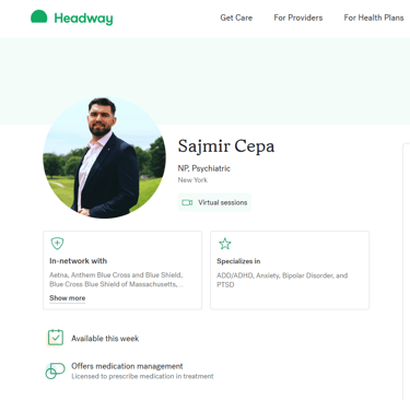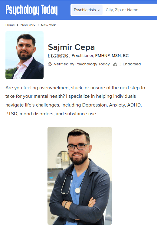 You can book with Sajmir on multiple platforms such as Psychology Today, Headway and ZocDoc.